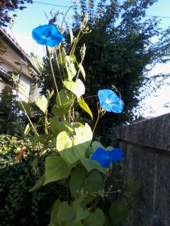 Dも休み〜7時に起きて外を見たら蒼い朝顔が咲いていたので急いで外に出て携帯で写す。