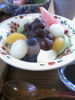 BOGへ行く途中で「甘味が食べたい」と言われA川のAカデミア館内で「あんみつ」を食べる。途中息子からメールが来て「今夜は帰らない」そうだ。想像するに、あちらのお宅で法事の続きで一杯頂いているのだろう。 BOGで山ほど買い物し、帰宅するころ、本降りの雨。