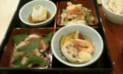 カニ玉、肉じゃが、ながいもとえのきの和え物、たくあん、煮魚