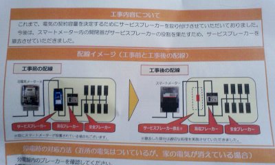 PCや読書で電気屋さんを待つ。結局10時過ぎに見える。「30分ほど停電します」と言われ、手持無沙汰で窓を拭いたりして過ごす。11時頃に作業終了。説明を受ける。なんとブレカースイッチが無くなった。(^^ゞ 容量オーバーになると外で切れて約10秒後に自動で「入」になるそうだ!あらびっくり。「9回ほど繰り返すと、10秒経っても繋がらなくなるので、営業所へ電話をすると、遠隔操作で通電する」そうだ・・進化?なんだね?ひゃー。こりゃ、息子夫婦にも話しておかないと、慌てるわなー
