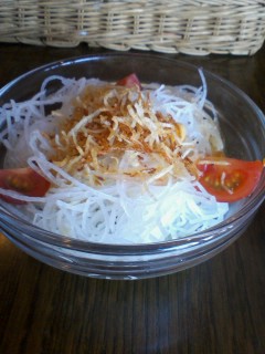 夕飯は赤魚の煮つけ・塩辛・漬物(白菜・きゅうり)・サラダ(キャベツ・パプリカ・レタス)・ウドの煮物 |
