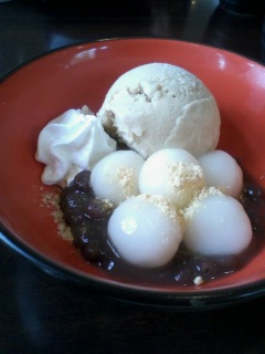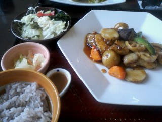 真だらと野菜の黒酢あん定食と白玉ぜんざい 黒糖アイス添え