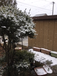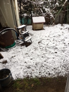 朝庭が白い。予報どうりの雪か?大きな春の雪、道路には積もらない。