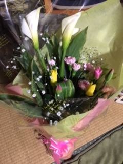 今日はホール、利用者さん12名中、体調不良2名様、お風呂6名様、早退スタッフ1名の中、月末で慌ただしく一日がなんとか無事過ぎた。その上17時からスタッフ会議で、16時40分に送迎から帰所した私を囲み、花束贈呈と副理事の挨拶で、バタバタと会議へ向かうスタッフで、あっさりしてて私にはちょうど良かった。看護師1名さんが泣いてくれて、けろりとしていた私はバツが悪い(笑)会議が始まった中、静かにロッカーを閉じ、職員通用口からお暇する、17時。 理事長は送迎に出ていて挨拶できず、駐車場で1人、お別れ気分で帰宅する。