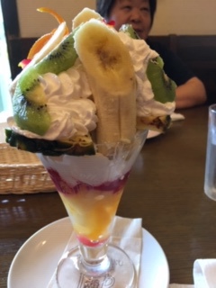 お二人はケーキセットなのに、私一人こっそり「誕生祝」気分でバナナパフェ(800円)(;^_^Aもっともすっぱいパインやキュウイは二人に手伝ってもらったが・・。 |