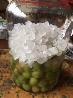 乾いた瓶に冷凍梅・氷砂糖・酢を入れる。 キュウリのジャーっと漬けも作る。