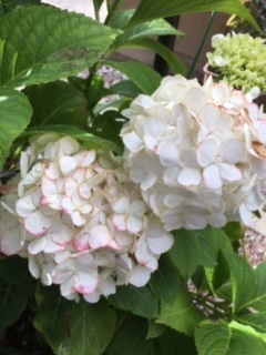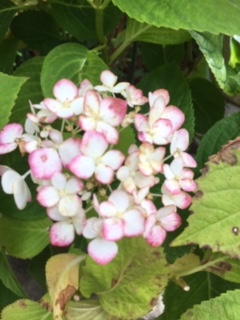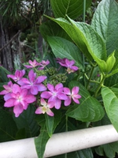 このアジサイ、なんという種類なんだろうか・・。花の縁がピンクだ。