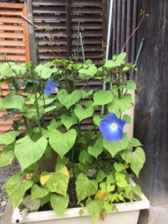 洗濯は外。 庭へ出て蒼い朝顔が咲いているのを発見し、驚く!つぼみがあるのを知らなかった。