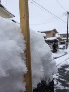 お昼ころ小降りになってきた。塀の上計れば19センチ。かいた道路はどんどん溶け始める、さすが春の雪。